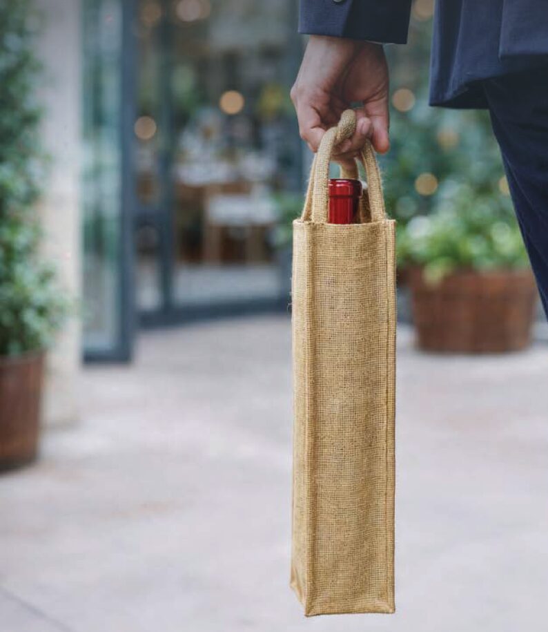 Štýlový a ekologický jutový obal, ktorý vám umožní pohodlne preniesť vlastnú fľašu vína do reštaurácie alebo na špeciálne večere. Praktický, odolný a šetrný k životnému prostrediu.